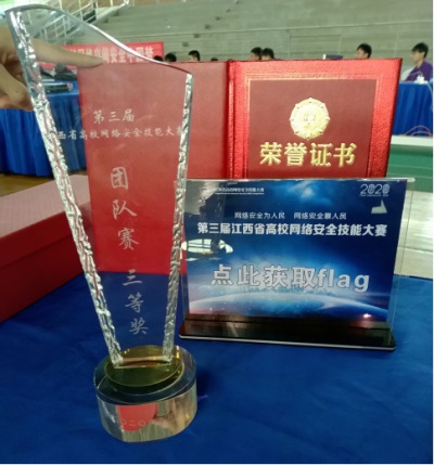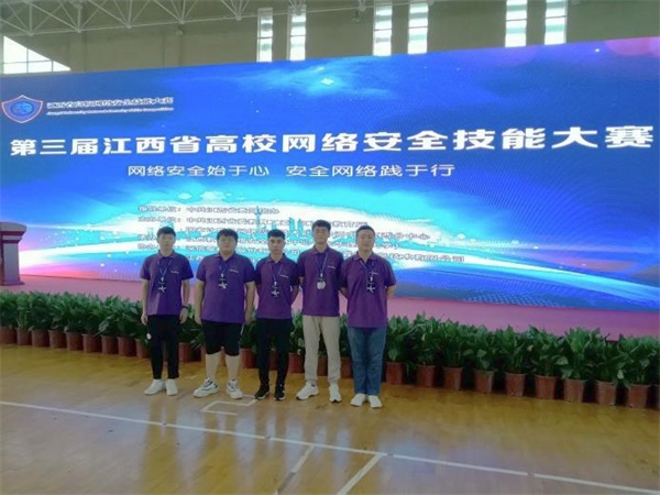9月15日,江西省第七届“国家网络安全宣传周”校园日压轴戏——第三届江西省高校网络安全技能大赛决赛在东华理工大学举行。我校高职学院由18级学生刘一润、付锋、熊志平、赵俊勤、候磊五人组成的“点此获取FLAG”战队在指导老师黄伟力的带领下,经过CTF技能答题、攻防对抗等环节,不畏强手,奋力拼搏,最终获得高职组三等奖,实现了在该项赛事上的新突破。