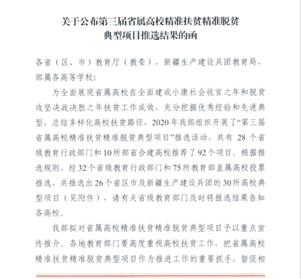 为全面展现省属高校在全面建成小康社会收官之年和脱贫攻坚决战决胜之年扶贫工作成效,充分挖掘优秀经验和先进典型,总结多样化高校扶贫路径,2020年教育部组织开展了“第三届省属高校精准扶贫精准脱贫典型项目”推选活动,共有28个省级教育行政部门和10所部省合建高校推荐了92个项目。根据推选规则,最终共推选出26个省区市及新疆生产建设兵团的30所高校典型项目。