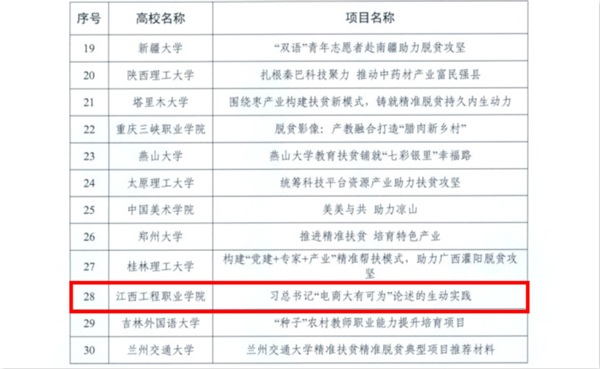 近日,教育部公布了第三届省属高校精准扶贫精准脱贫典型项目推选名单,我校高职学院《习总书记“电商大有可为”论述的生动实践》入选2020年教育部省属高校第三届精准扶贫精准脱贫典型项目。