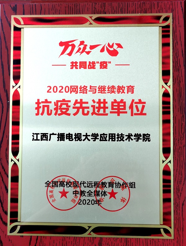 大会开幕式上举行了“2020网络与继续教育抗疫先进单位”颁奖。江西广播电视大学应用技术学院由于在疫情期间保障“停课不停学”方面做出的突出贡献,为国家开放大学、网络与继续教育行业赢得了良好的社会口碑,被全国高校现代远程教育协作组、中教全媒体评选为“2020网络与继续教育抗疫先进单位”。