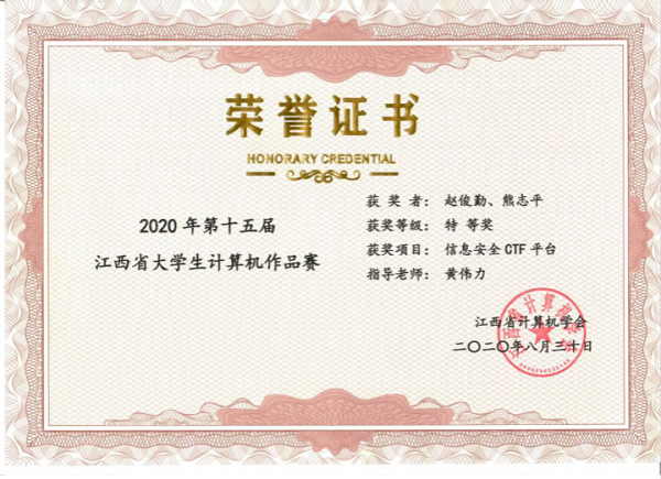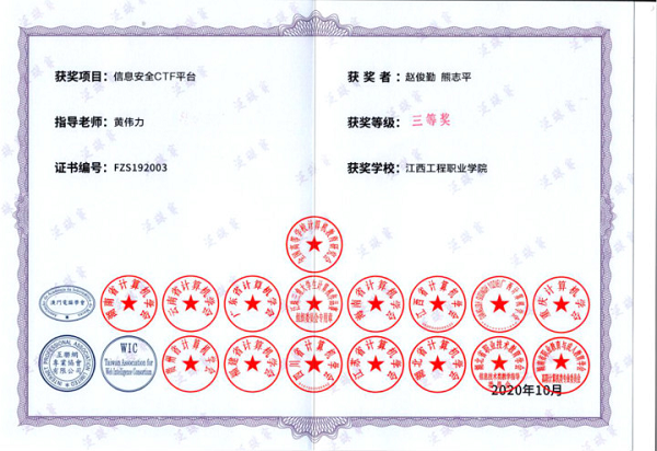 第十五届泛珠三角+全国大学生计算机作品赛总决赛于10月25日-30日在珠海成功举行,我校高职学院信工分院2018级软件专业赵俊勤、熊志平作品《信息安全CTF平台》(指导老师:黄伟力)获得全国三等奖。