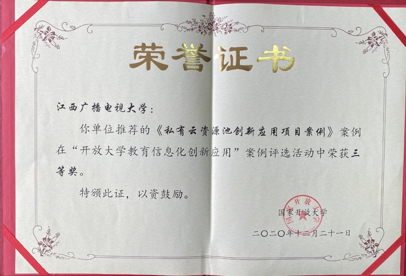 近日,国家开放大学公布开放大学教育信息化创新应用案例评选结果,我校报送的《私有云资源池创新应用项目案例》荣获三等奖。据悉,本次活动共收到110个信息化创新应用案例,经过专家评审,最终确定一等奖5个、二等奖10个、三等奖17个、优秀案例奖10个、组织奖单位6个。活动旨在探索先进信息技术在开放教育中的创新应用,推进线上线下融合的开放教育不断蓬勃发展。(文字:徐星星 图片:现代教育技术中心 责任编辑:张睿)