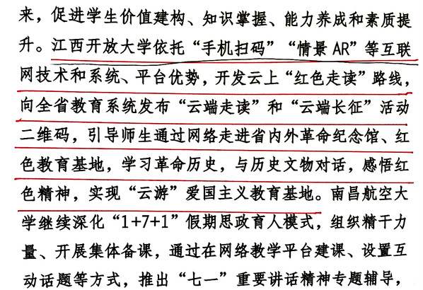 暑假期间,我校持续推动党史学习教育走深走实,引导学生走入“云上课堂”,做到暑期思政工作不断线、不掉线。近日,由江西省高校思想政治工作领导小组办公室主办的《思政前沿》(2021年第4期)刊载《全省高校暑期思政工作不断线》一文,文章引用我校开展暑期思政工作相关举措:诸侯快讯ok1122登录入口依托“手机扫码”“情景VR”等互联网技术和系统、平台优势,开发云上“红色走读”路线,向全省教育系统发布“云端走读”和“云端长征”活动二维码,引导师生通过网络走进省内外革命纪念馆、红色教育基地,学习革命历史,与历史文物对话,感悟红色精神,实现“云游”爱国主义教育基地。