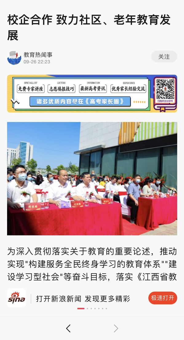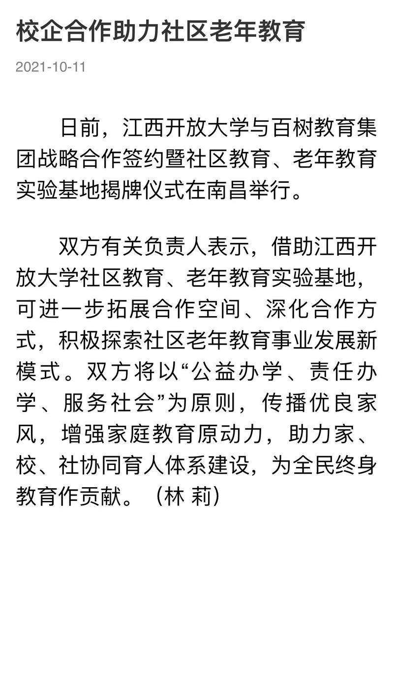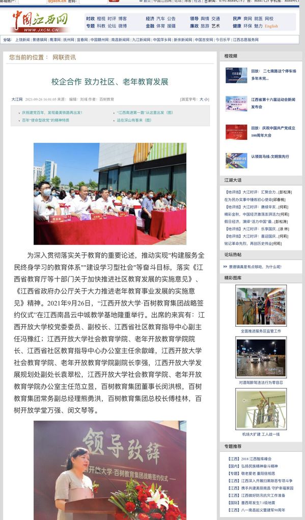 日前,诸侯快讯ok1122登录入口与百树教育集团战略合作签约暨社区教育、老年教育实验基地揭牌仪式在南昌举行。江西日报、大江网、江西新闻等多家媒体报道我校以校企合作助推社区老年教育。