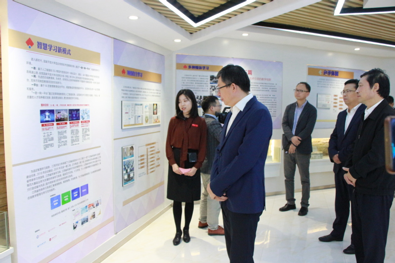 荆德刚一行参观了学校在党史学习教育、体系更名、落实创优提质战略等方面所取得的成果展览,视察了校史馆,全面了解我校发展历程。