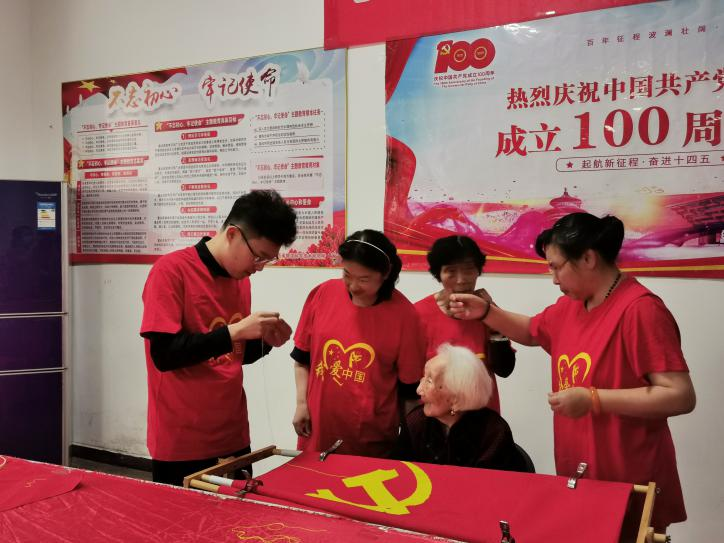 百岁老人胡雪贞是江大南路社区的居民,耳聪目明,1917年12月17日出生,解放前在南昌民生染布厂做印花工,见证了新中国的诞生和中国共产党百年风雨历程。在中国共产党成立100周年之际,为了感党恩、表心意,她做出大胆决定,和社区人员、学院学生同绣党旗。历时二个月,她把对党的热爱、对党的感恩,从指尖融入一针一线绣进党旗,最终把一幅1.4m×0.9m的党旗呈现大家眼前。在活动过程中,胡雪贞老人还和学生讲起了红色故事,希望同学们吃水不忘挖井人,珍惜今天的幸福生活,好好工作。