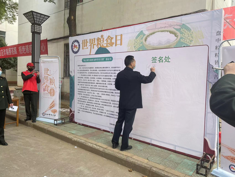 临近午餐时间点,志愿者们又前往食堂,开展制止餐饮浪费宣传活动。青云谱校区食堂门口,张承良、杨柳以及学院师生代表纷纷在倡议书上签名,承诺切实践行“光盘行动从我做起”的倡议。学生食堂内还开展了“光盘换勺”活动,以此引导学生养成节约粮食的生活习惯。