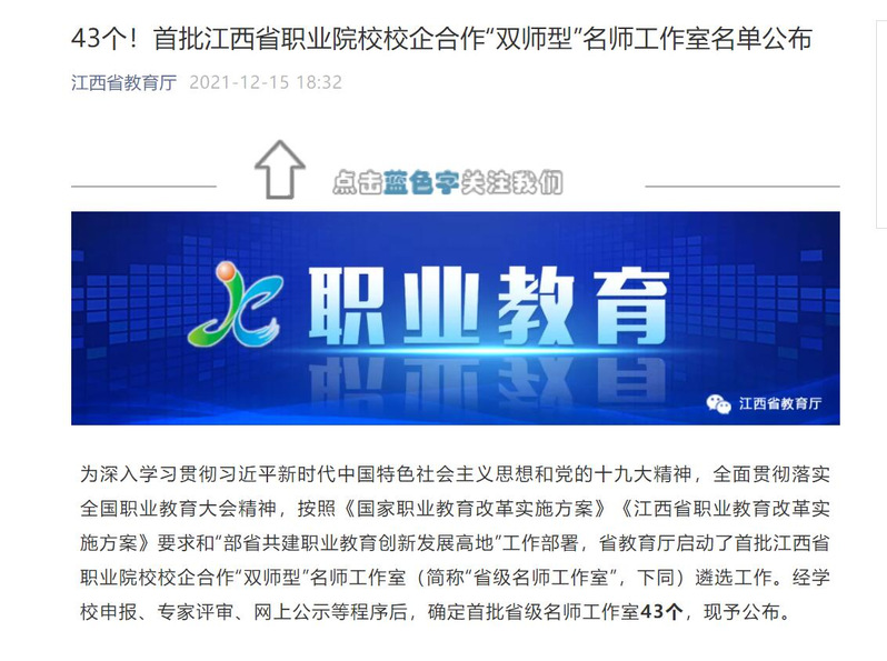 近日,省教育厅启动了首批江西省职业院校校企合作“双师型”名师工作室(简称“省级名师工作室”,下同)遴选工作,由工程职院经管学院祝维亮教授领衔申报的“祝维亮”双师型名师工作室被认定为江西省首批职业院校省级名师工作室,实现了学校在该项目上的新突破。