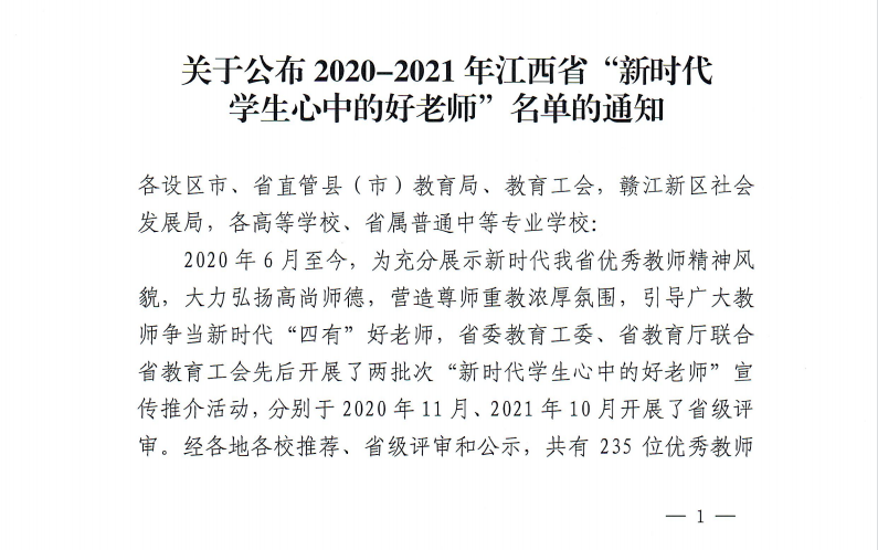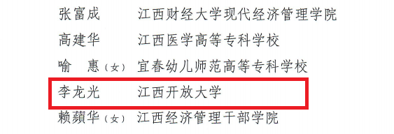 近日,由省委教育工委、省教育厅、省教育工会联合主办的江西省“新时代学生心中的好老师”宣传推介人选名单正式揭晓。经校工会推荐,省级评审和公示,我校教师李龙光荣获2020—2021年江西省“新时代学生心中的好老师”称号。