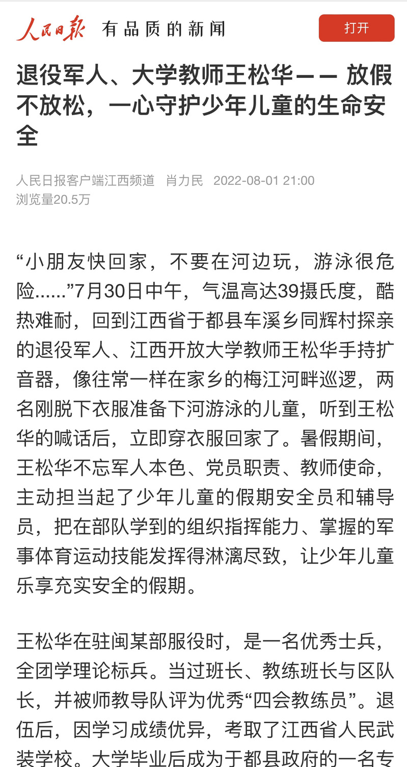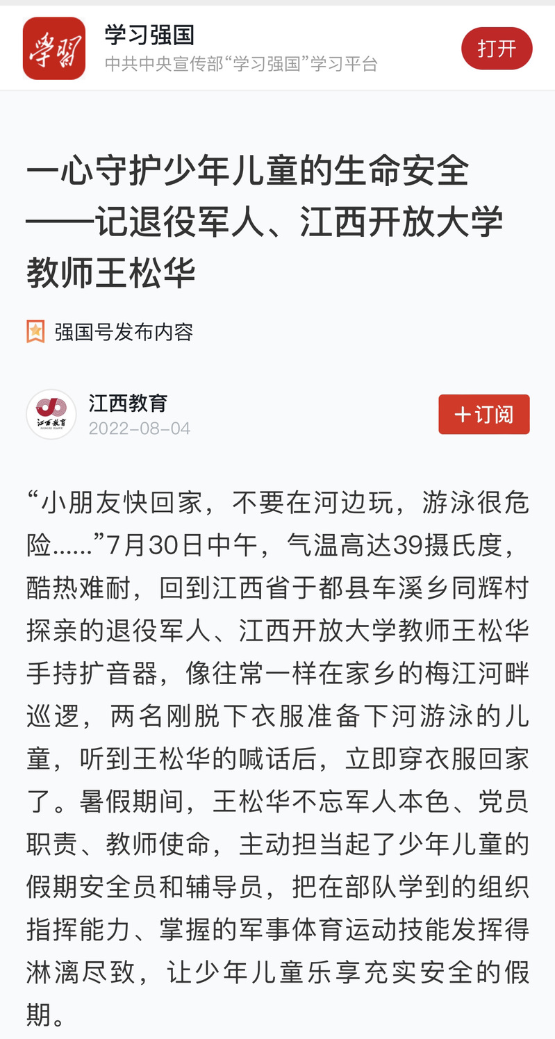 暑假期间,我校教师王松华主动担当起家乡少年儿童的假期安全员和辅导员,每日巡查河堤守护少年儿童生命安全,并主动教授小孩子体育运动技能,让少年儿童乐享充实安全的假期。人民日报客户端江西频道、学习强国对此进行报道,中国教育发布app首页推荐。