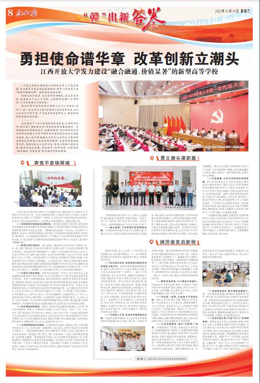 今日,江西日报8版整版报道学校学习宣传贯彻党的二十大精神,全面建设融合融通、价值显著新型高校。