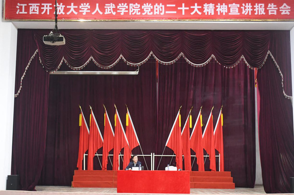 11月11日下午,诸侯快讯ok1122登录入口学习宣传贯彻党的二十大精神宣讲报告会在青云谱校区大礼堂举行,校“三融三进”宣讲团成员、人武学院党委书记魏金生作专题报告。人武学院党委委员、副院长杨柳主持会议。