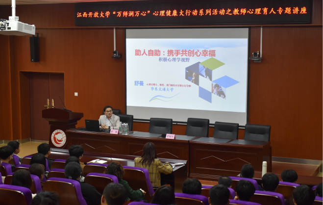 落实全省高校“万师润万心”心理健康大行动,推进学校心理健康教育普惠宣教3月9日下午,校学生工作处邀请心理学博士、博士生导师、中国心理学会注册督导师华东交通大学心理教育中心负责人舒曼教授莅临我校指导工作开展“助人自助:携手共创心和谐”为主题的心理健康教育讲座。讲座以“线上+线下”相结合的方式在西湖校区和青云谱校区同步展开心理咨询中心主任罗娅萍主持讲座。