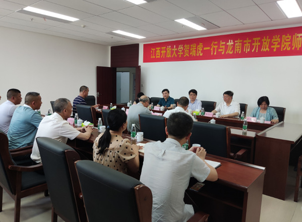 在寻乌开放学院,贺瑞虎特别询问了学院办学规模、师资队伍等情况深入掌握开放大学系统基层一线办学单位基本情况,了解他们履行相应办学和服务职能的能力。在龙南开放学院,贺瑞虎一行认真听取了龙南开放教育工作发展情况和新兴产业学院工作情况,并与学校教师进行座谈交流,贺瑞虎强调各学院要因地制宜推进产教协同育人,不断加强教育资源共享,培养更多留得住、用得上、用得好的新兴人才