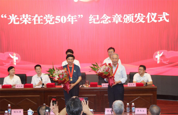 校党委书记贺瑞虎,校党委副书记、校长黄平槐为老党员代表颁发“光荣在党50周年”纪念章并敬献鲜花,现场喝彩不断、掌声阵阵,与会人员一致向荣获纪念章的革命前辈致以崇高敬意和热烈祝贺。