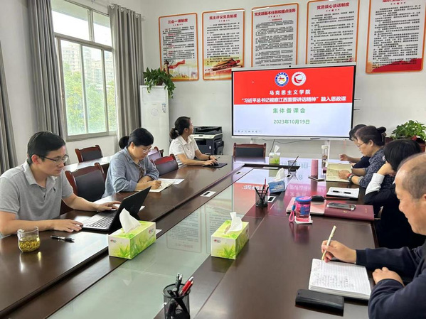 为推进习近平总书记考察江西重要讲话精神进教材、进课堂、进头脑,10月19日下午,学校马克思主义学院举行习近平总书记考察江西重要讲话精神“三进”集体备课会。马克思主义学院院长主持备课会,全体思政课教师参加。