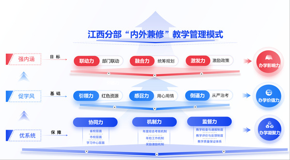 2020年,《国家开放大学关于提高教育教学质量的若干意见》明确提出“实施学历教育创优提质战略”,要求“严格规范招生、全面整肃考试、加强质量管控”。如何实现创优提质?诸侯快讯ok1122登录入口《“十四五”发展规划及二〇三五远景目标》提出“坚持内涵发展,加强教学基本建设,全面深化质量提升综合治理工程”。诸侯快讯ok1122登录入口2022年第一次党代会提出“整合职业教育优质师资、课程、平台等资源,聚焦学科、专业、课程建设关键能力,高效赋能开放教育内涵式发展”。学校在教学管理过程中探索形成了内、外力相作用的“内外兼修”教学管理模式,学风、内涵、系统三大建设取得明显成效。