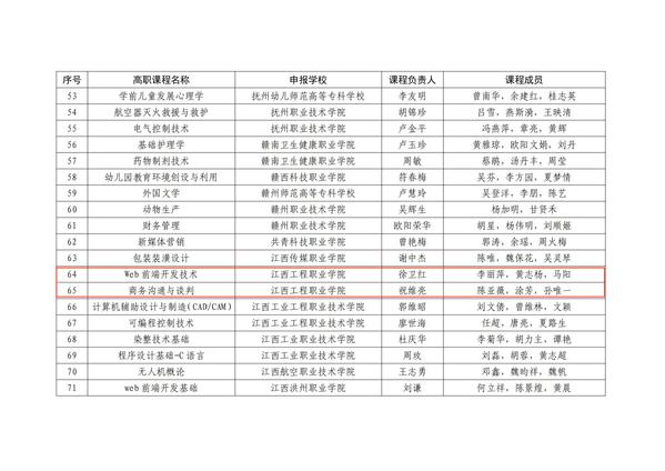 近日,江西省教育厅印发《关于公布 2023 年江西省职业教育一流核心课程(线下)认定结果的通知》(赣教职成办函〔2023〕34号),智能技术学院《Web前端开发技术》和数字经济学院《商务沟通与谈判》被认定为2023年江西省职业教育一流核心课程。