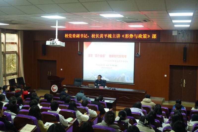 12月21日,校党委副书记、校长黄平槐来到西湖校区,面向广大学生、团员青年和党员干部、思政课教师作形势与政策报告。他强调,广大师生要从新时代的伟大变革和伟大成就中感悟习近平新时代中国特色社会主义思想的真理力量和实践伟力,善于用这一思想观察世界、思考问题,从中汲取前进的智慧和力量,在坚定“四个自信”中刻苦学习、强化担当、锤炼本领,为投身中国式现代化的火热实践做好准备、贡献力量。
