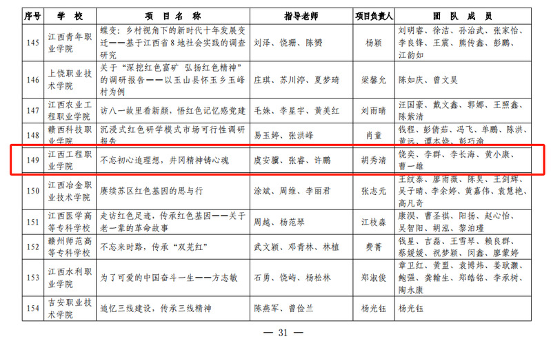 近日,第十八届“挑战杯”江西省大学生课外学术科技作品竞赛圆满闭幕。学校参赛作品不忘初心追理想,井冈精神铸心魂荣获红色专项活动三等奖。