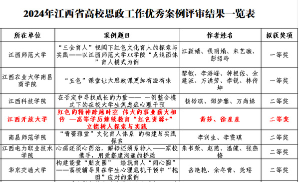 近日,江西省教育厅公布了2024年度全省高校思想政治工作优秀论文和优秀案例征集活动的评选结果。学校报送的思政论文《算法推荐视域下大学生网络思想政治教育的“难为”与“可为”》《万“思”润万心——基于CiteSpace可视化分析大学生心理健康教育融入思政教育的研究现状与发展趋势》分别荣获优秀论文一等奖、二等奖,思政案例《红色的精神跨越时空伟大的事业薪火相传——高等学历继续教育“红色资源+”立德树人探索与实践》荣获优秀案例二等奖。