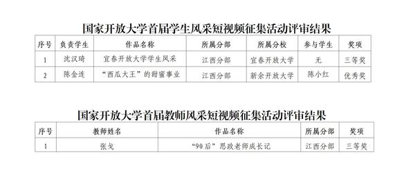 深入贯彻落实党的二十大精神,大力弘扬和践行教育家精神,生动展示新时代国家开放大学办学体系教师“四有”好老师的形象与风采,国家开放大学举行了首届教师、学生风采短视频征集活动。近日,国家开放大学揭晓活动评选结果,宜春开放大学选送作品《宜春开放大学学生风采》荣获学生组一等奖,新余开放大学选送作品《“西瓜大王”的甜蜜事业》荣获学生组优秀奖,省校选送作品《“90后”思政老师成长记》荣获教师组三等奖。