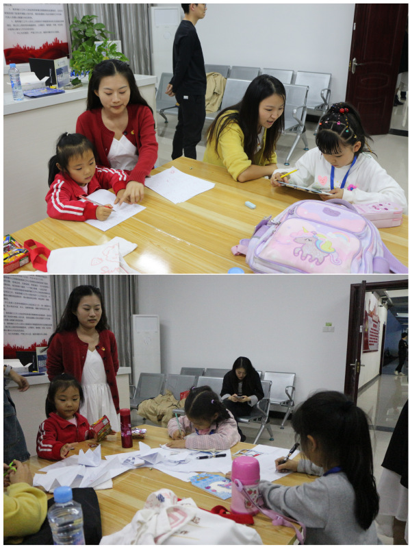 11月11日,夜幕降临,江开夜校在西湖校区如期开课。学校师生一站式服务中心的灯也亮了起来,党员志愿者们站在门口,将随同夜校学员们上课的孩子接管过来,让学员们能安心上课。