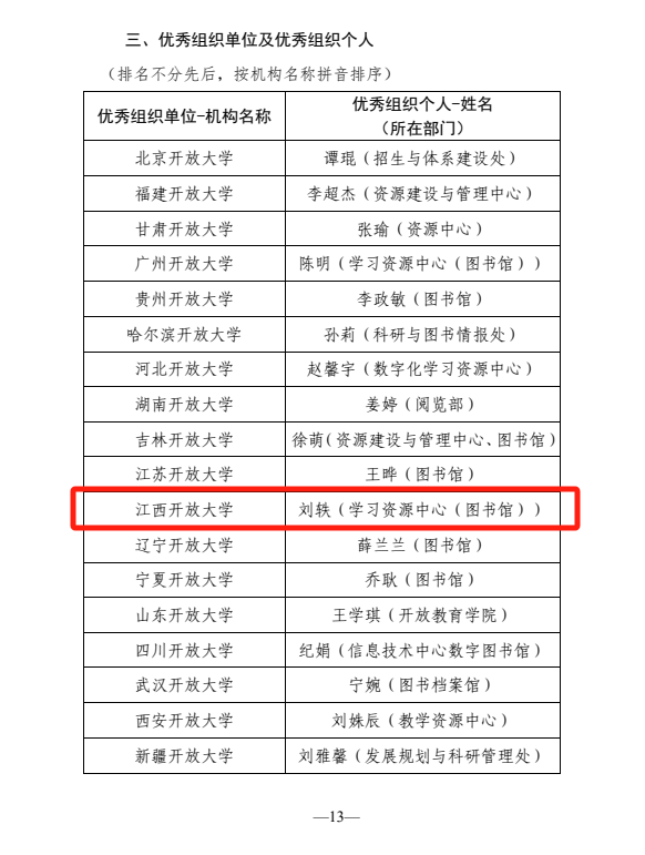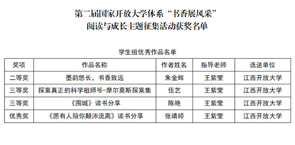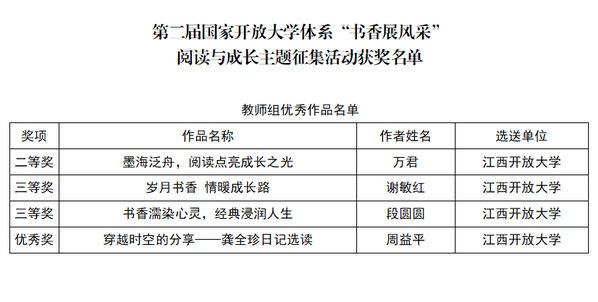 近日,国家开放大学公布了本次活动获奖名单。我校选送14个作品,教师组和学生组分别获二等奖1个,三等奖2个,优秀奖1个。此外,我校还荣获优秀组织单位奖,教师刘轶获优秀组织个人。