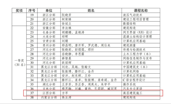 近日,国家开放大学公布了“第二届工学科类专业教师教学技能大赛”获奖名单。我校青年教师方早主讲的《高层建筑施工》课程在全国众多参赛作品中脱颖而出,斩获一等奖。